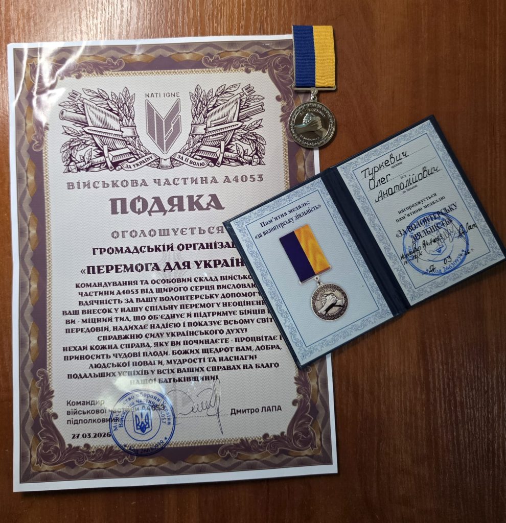 Командування та особовий склад військової частини А4053 висловили вдячність ГО «Перемога для України» за постійну та вагому допомогу. Для нас честь підтримувати тих, хто боронить Україну. Але ми знаємо: ця нагорода належить не лише нашій команді. Вона належить кожному донору, волонтеру та підтримувачу, який доклав до цього зусиль. Рухаємося далі до спільної мети!